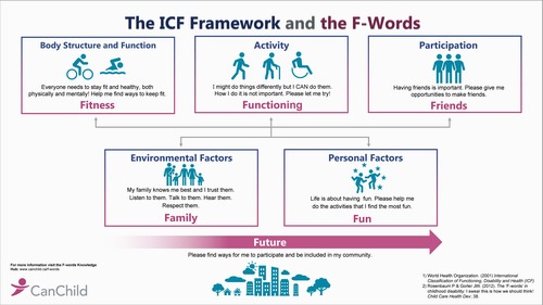در چارچوب بین المللی طبقه بندی عملکرد و ناتوانی، مشارکت داشتن در اجتماع، داشتن فعالیتهای مناسب برای انجام دادن، سلامتی ساختارها و عملکردهای مختلف بدن، ویژگی های فردی و ویژگی های محیطی و زمینه ای به عنوان عوامل موثر در ایجاد سلامتی مطرح هستند.